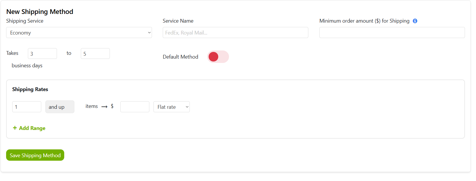 Default Method: Toggle this option to green if you want this option to be selected by default on frontend for buyers while placing shipping orders OR toggle to red so buyer will manually select shipping method from your created list of shipping methods.