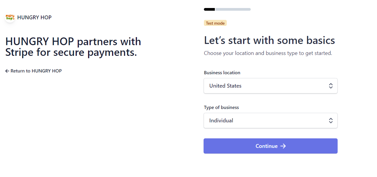 Note: Follow the instructions to set up the Stripe account. The instructions may differ from those below due to updates on the Stripe site.