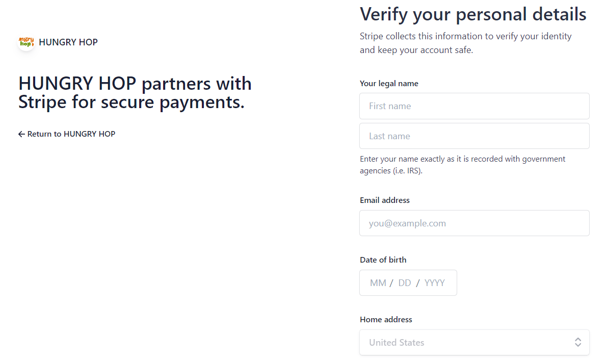 After successfully onboarding with Stripe through Hungry Hop and activating your account, you can continue entering additional details for your store.