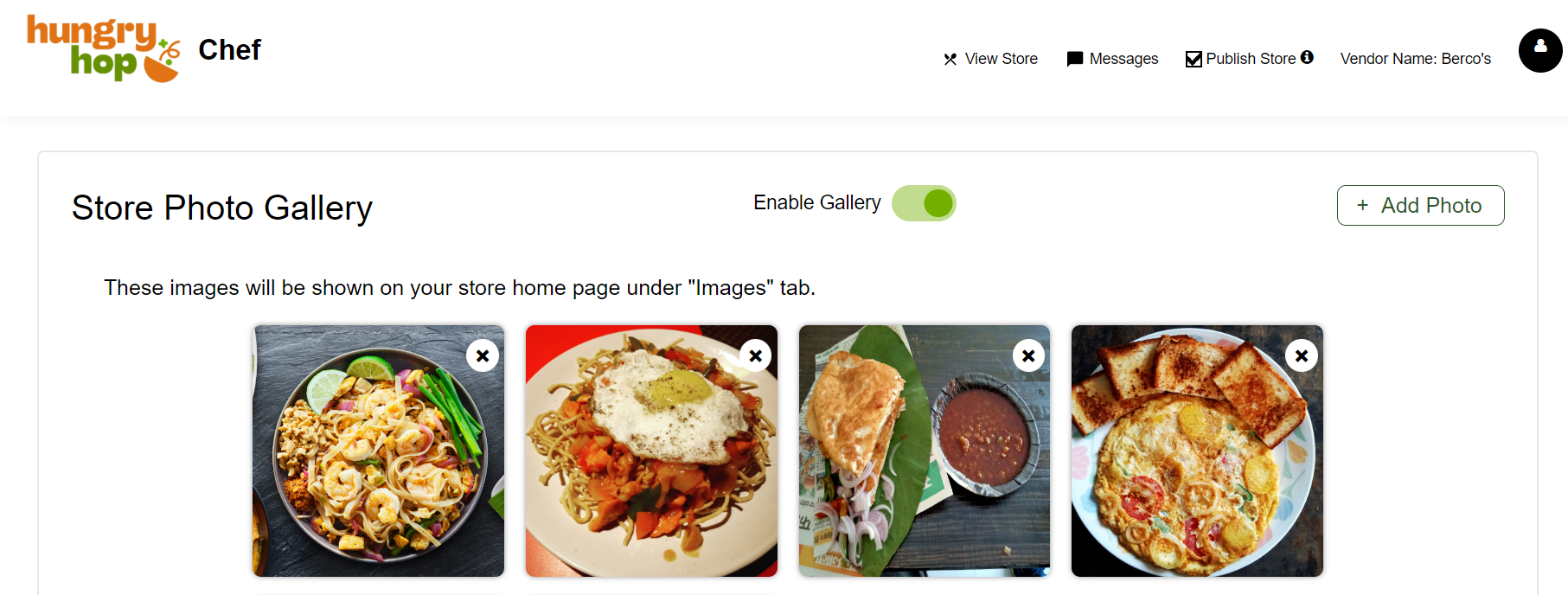 Upload images of your store here to display them on your store's homepage under the "Photos" tab. These images can be your dish item images or your store images. Note that images for individual menu items can be uploaded later using the “Menu Management” option.