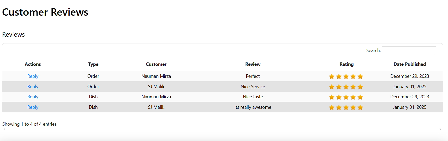 In this section, you can view reviews submitted by customers about your store. Once an order is successfully completed, customers can leave feedback for the overall order and individual items within it. These reviews will also appear in the reviews tab on your storefront.