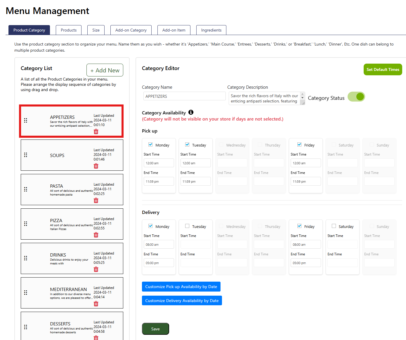 Set Default Times: Click this button (located at the top right) to reset the category availability times to match your store’s default operating hours.
