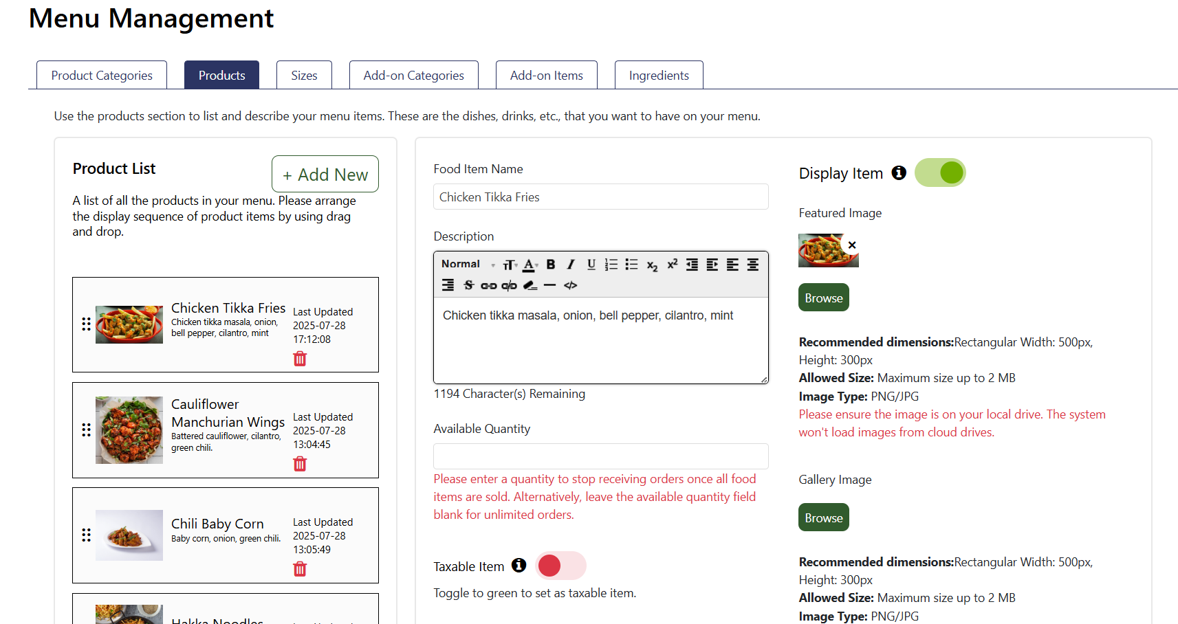 Products are individual menu items that you will sell. Click "Add new" and provide the Food Item's Name, Description, and category. You can turn the item's status on or off according to its availability.