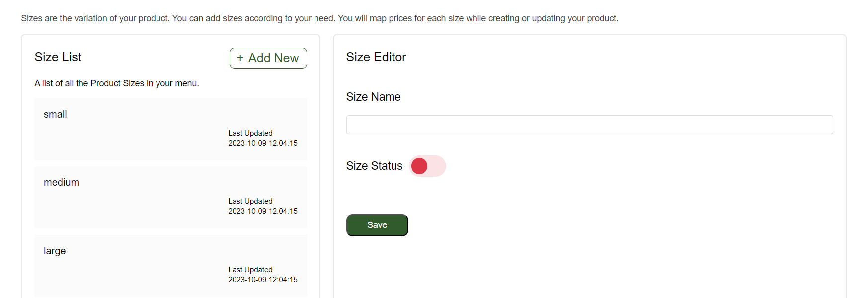 The "Size" section is where you can manage the different size variations for your dish. This screen allows you to customize and organize sizes, offering flexibility to your customers. Here’s how to set it up: