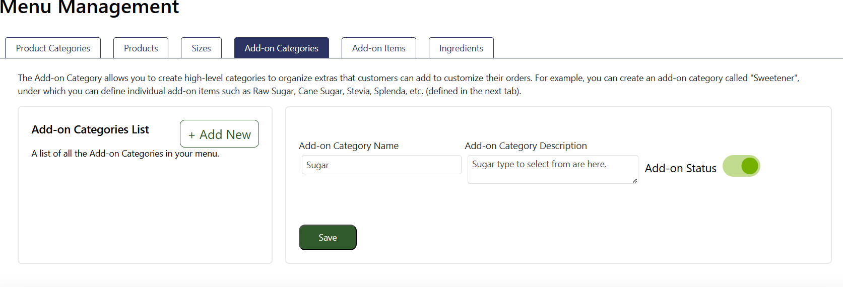 Similarly, the “Add-on Categories” option allows you to create high-level categories to organize extras that customers can add to customize their orders. For example, you can create an add-on category called "Sweetener", under which you can define individual add-on items, such as Raw Sugar, Cane Sugar, Stevia, Brown Sugar, Splenda, and others. These add-on items will be defined in the next section.