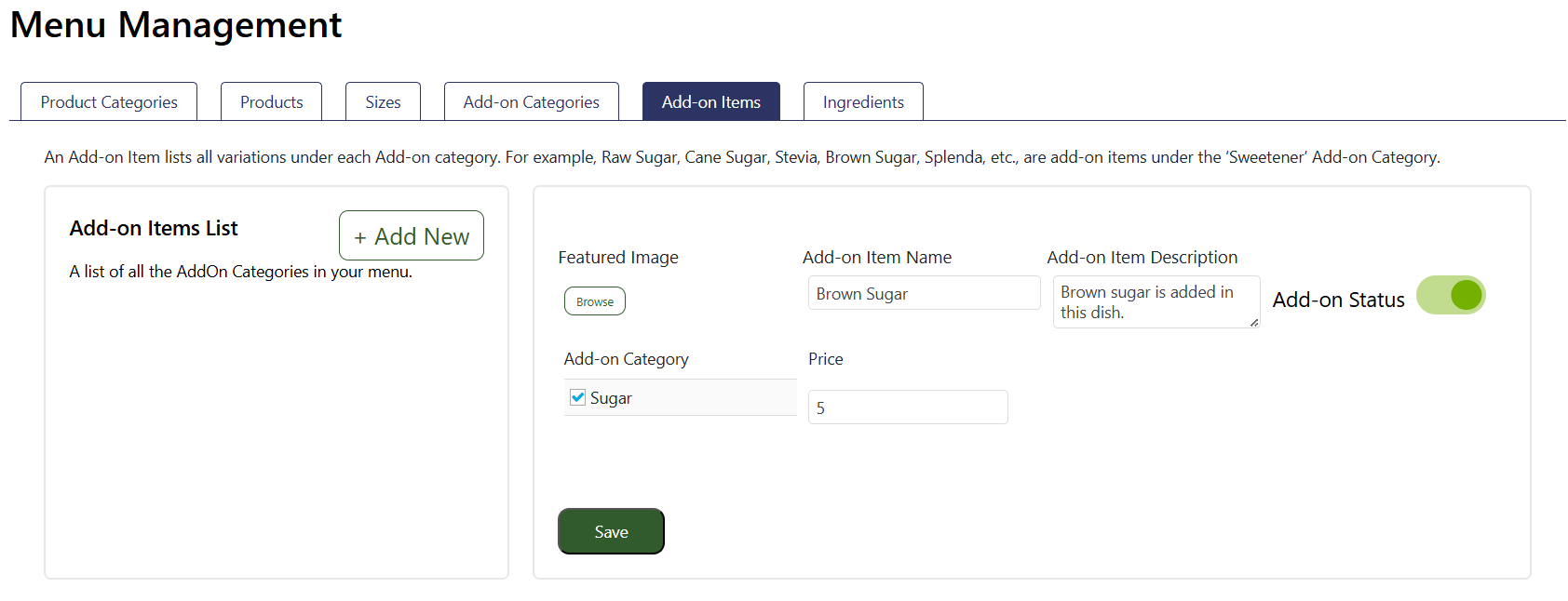 An Add-on Item lists all variations under each Add-on category. For example, Raw Sugar, Cane Sugar, Stevia, Brown Sugar, Splenda, etc., are add-on items under the ‘Sugar’ category you created in the previous “Add-on Categories” tab.