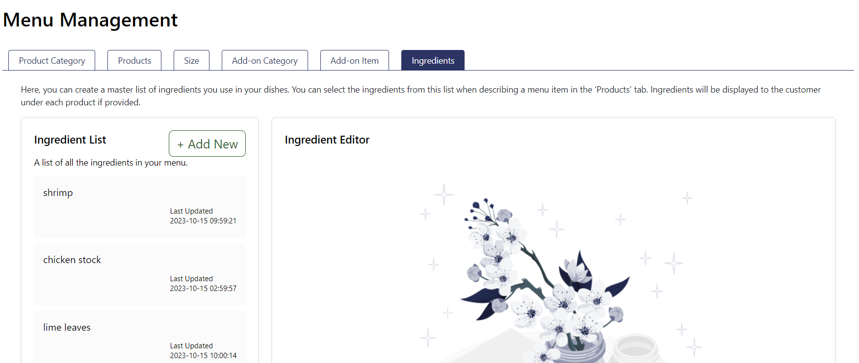 Here, you can create a master list of ingredients you use in your dishes. You can select the ingredients from this list when describing a menu item in the ‘Products’ tab. Ingredients will be displayed to the customer under each product if provided.