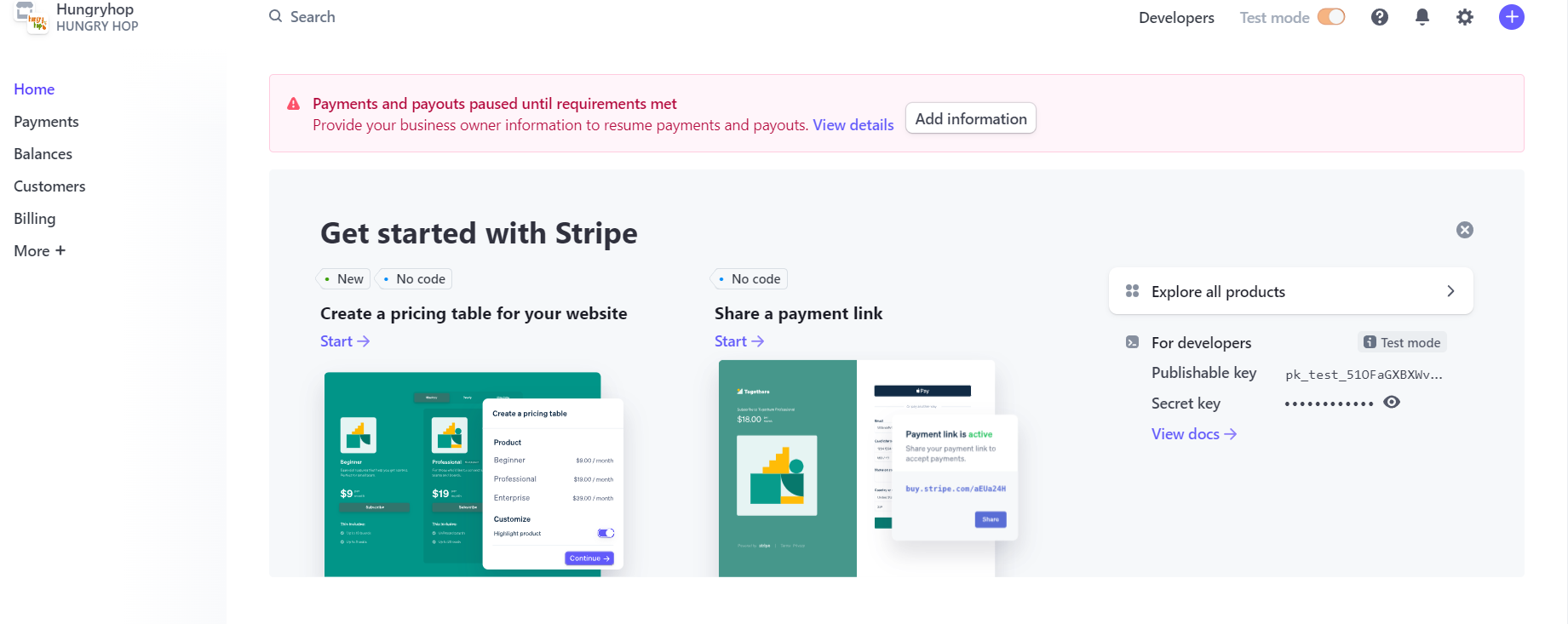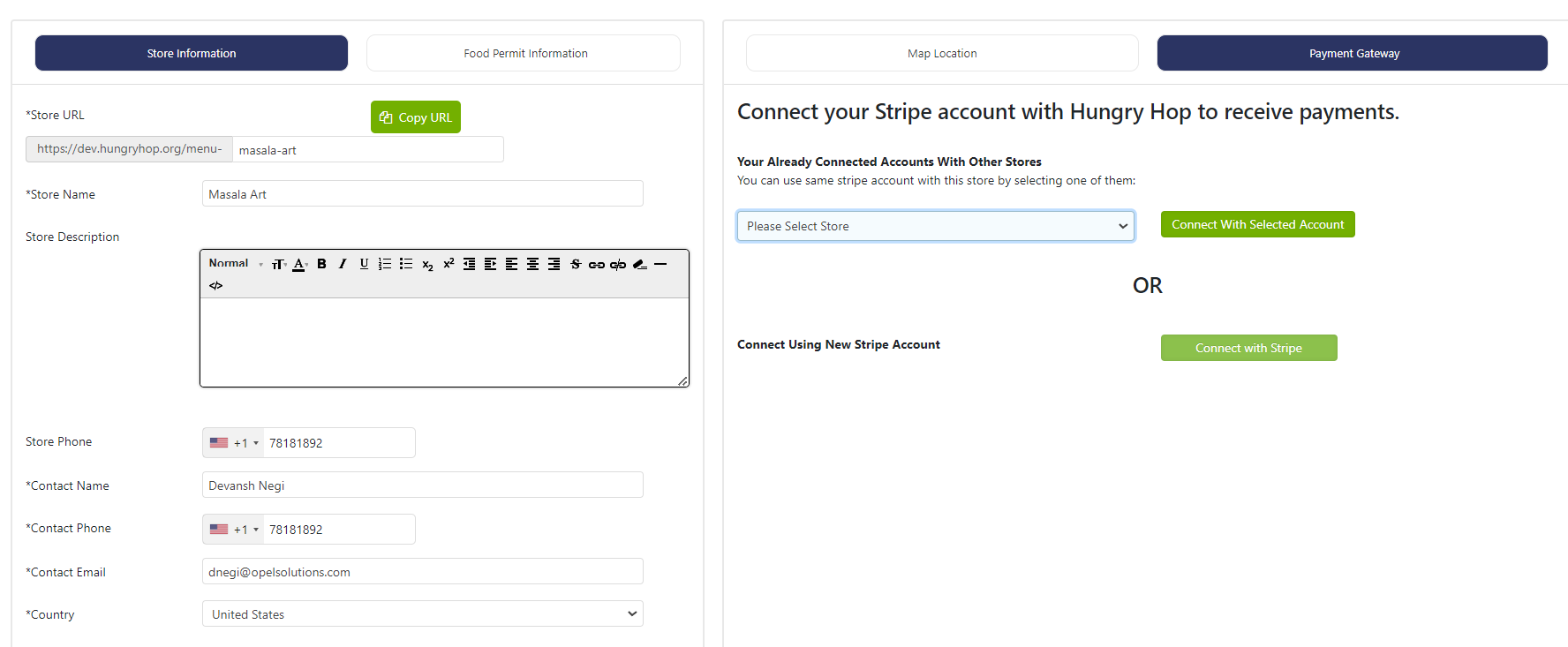 Next, set up your Stripe account to get paid through Hungry Hop. Click the 'Payment Gateway' button to link it to your Stripe account. This step is essential as, without a connected Stripe account, your store won't be operational. You can connect multiple stores to a single Stripe account or have a different Stripe account for each store.