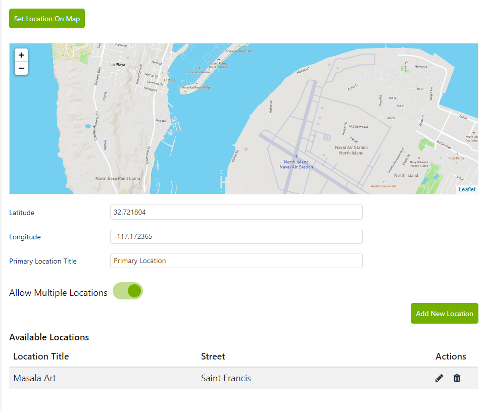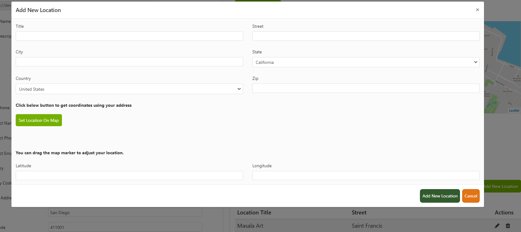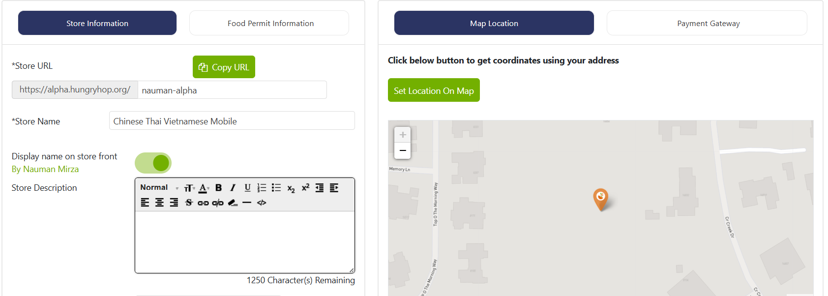 Click on 'Set Location on Map.' A map showing a pin at the business address entered in the 'Store Information' section will appear. Here, you can adjust the location of the drop pin if the shown location is not accurate. This is the location where customers will come to the store or pick up their food. Once you have selected the primary location, you can add more locations if your store is mobile (this option is available for all food permits except MEHKO).