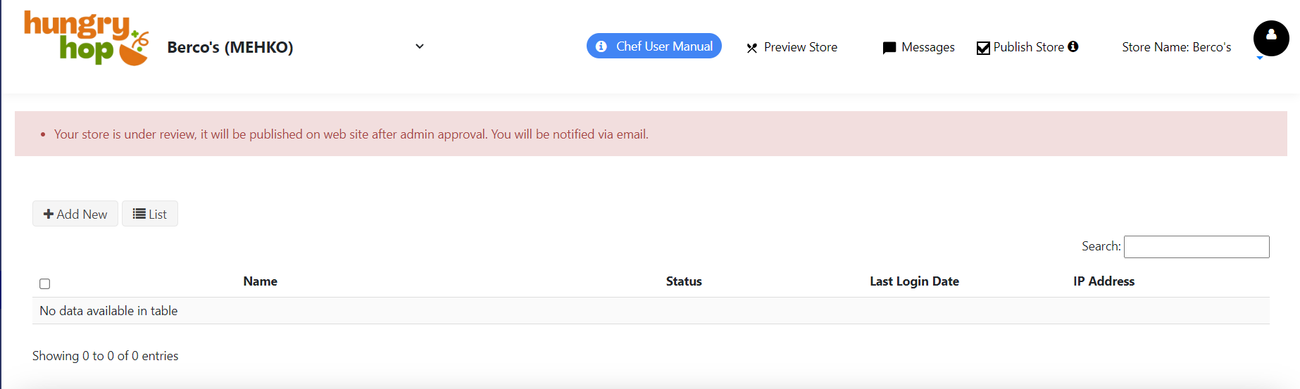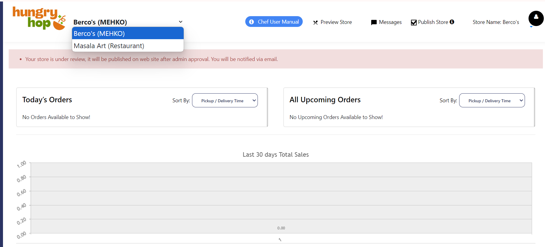 Upon logging in to your store, you'll see a page showcasing today's order and order history from the past 30 days. As your store becomes operational, you can track your total sales here. At the top left corner, you can also change between stores if you operate more than one store.