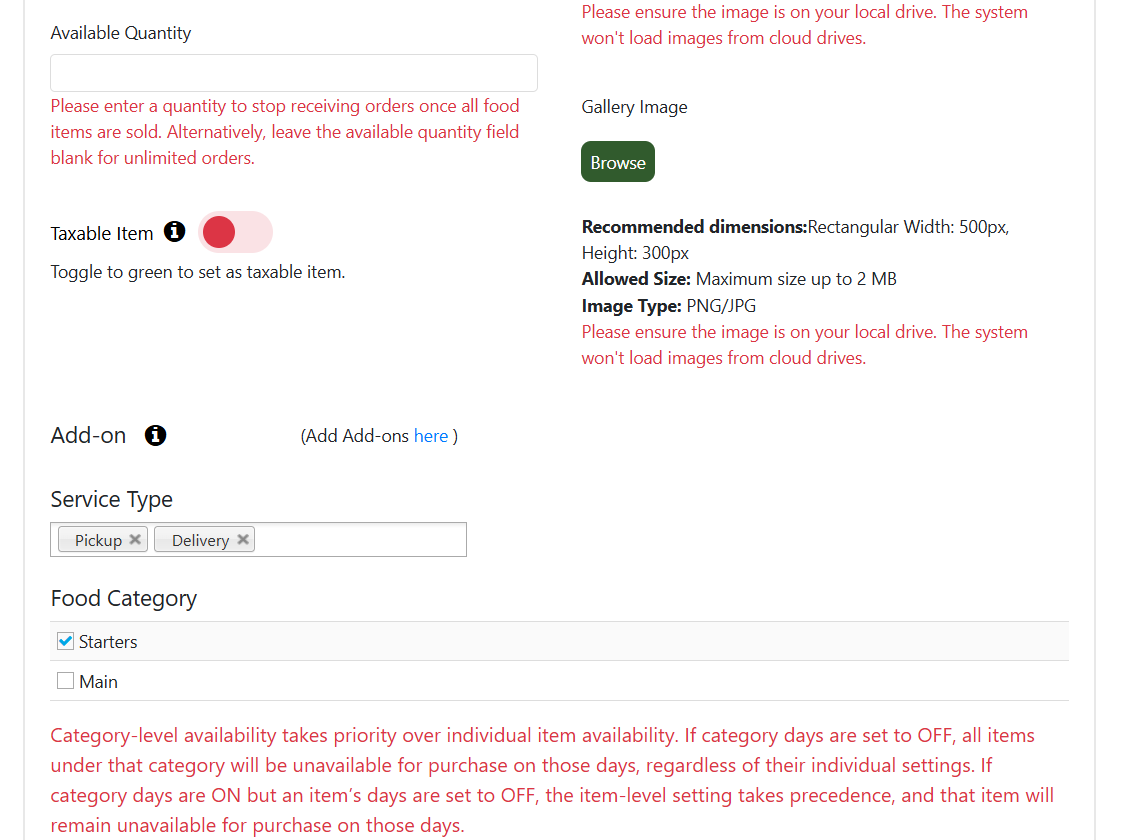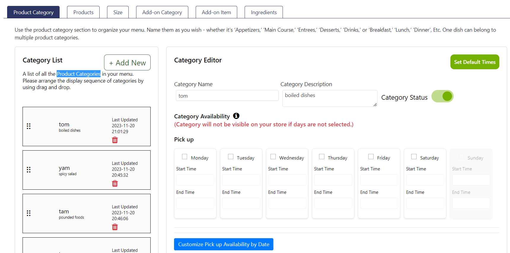 Note: Category-level settings can override individual dish availability. If a category is set to OFF, your dish won’t be available on those days regardless of its own settings. If the category is ON but your dish is set to OFF, your dish will remain unavailable on those days.