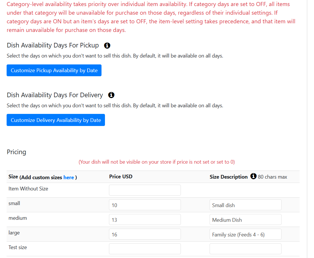 This screen allows you to configure availability days and pricing details to ensure your dish is accessible and priced right for your customers. Here’s how to proceed: