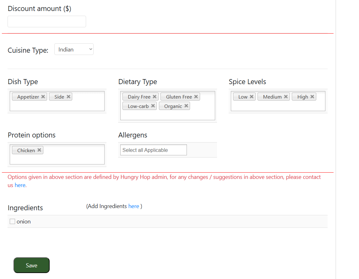Use these settings to set the details and preferences of your dish. These settings power search and filtering across the platform, helping customers find the most relevant products. Choose your options carefully to ensure your dish appears correctly in filtered results based on customer selections.
