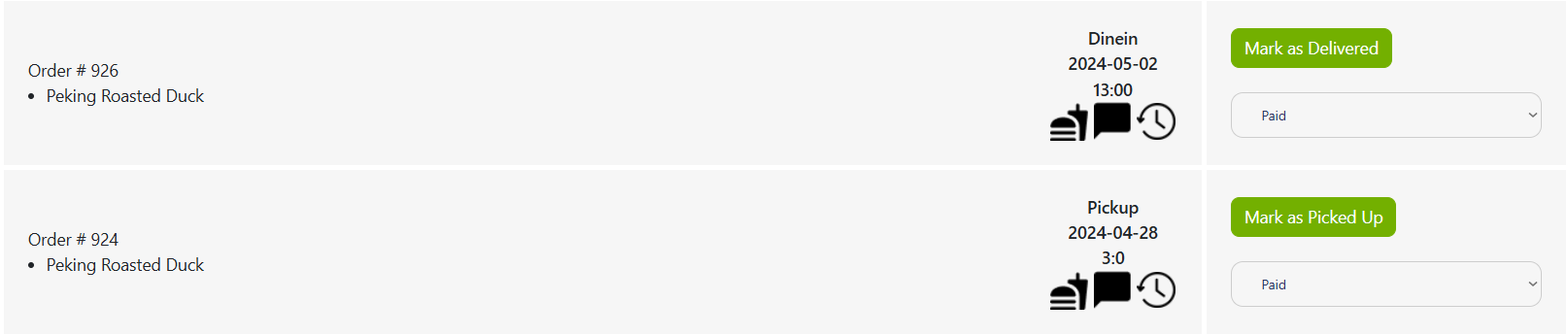 For the initial “Paid” order, you will see the status “Paid” in front of each order, indicating that the order has been paid and is now ready for preparation and completion.
