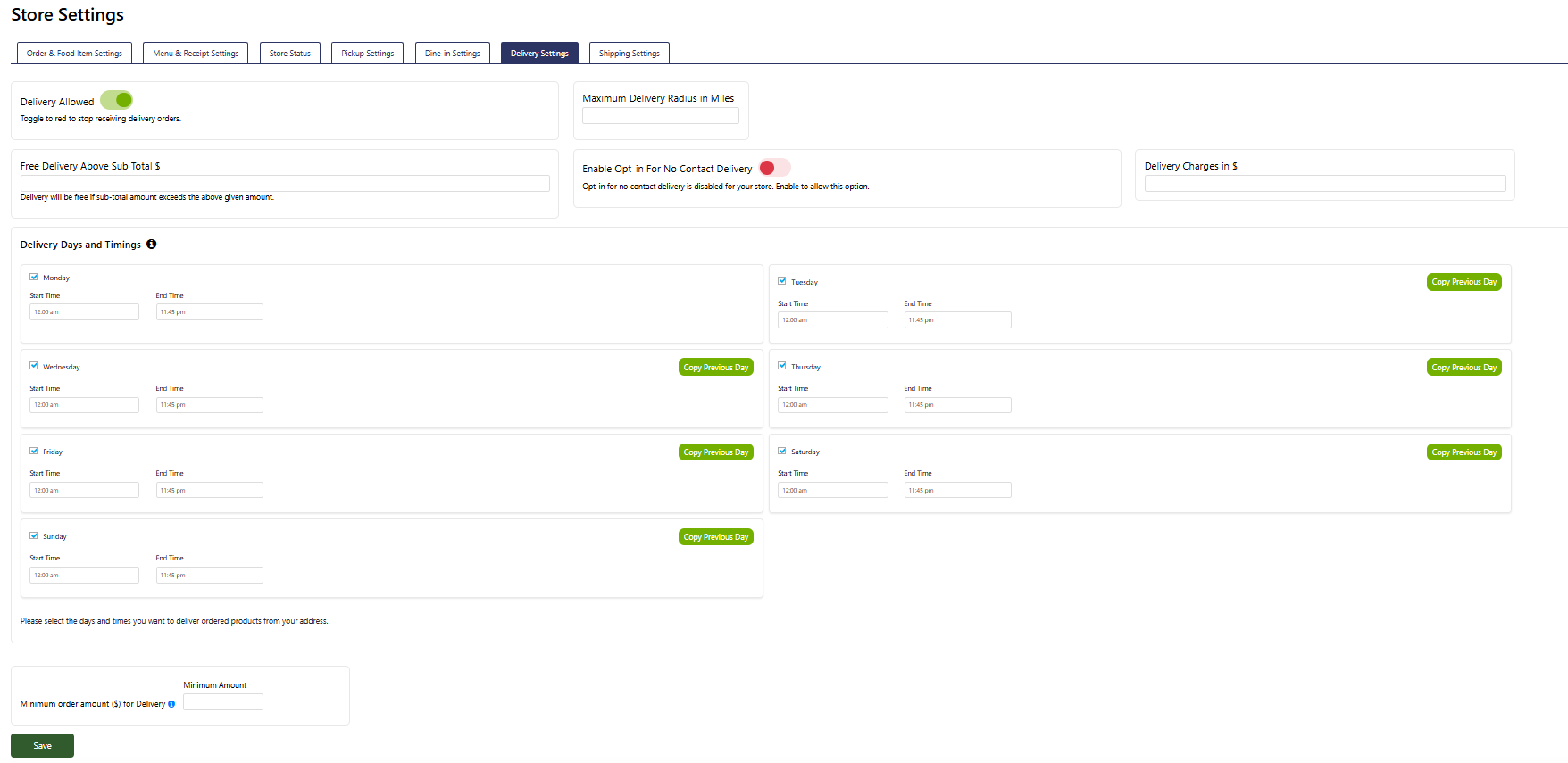 Delivery Days and Timings: Set the specific days and start/end times for delivery orders by selecting each day and entering the appropriate hours. This feature enables you to customize your store's weekly delivery schedule fully, ensuring customers are aware of when delivery is available.