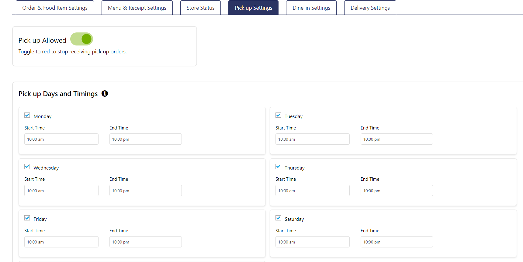 The following three tabs let you manage your Pickup, Dine-In, and Delivery settings, allowing you to customize them as desired and set daily hours. The settings in the 'Store Status' tab take precedence over these settings.
