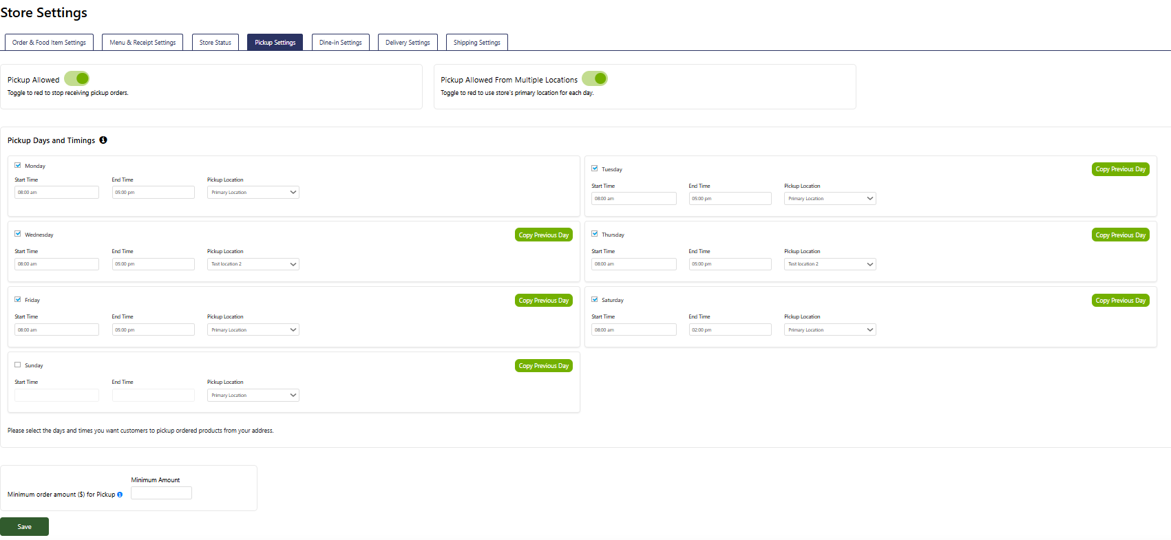 Pickup Days and Timings: Specify the days and start/end times for pickup orders by selecting each day and entering the corresponding hours. This feature allows you to fully customize your store's weekly pickup schedule, ensuring customers know when they can collect their orders.