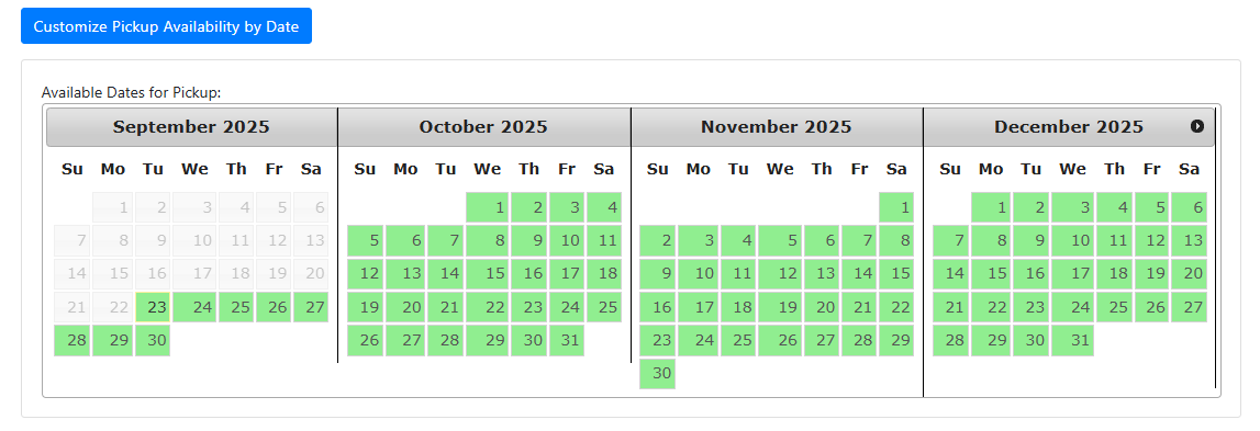 Customize Pickup (or Delivery) Availability Days: Use this feature to set specific calendar days when the category will be available to customers. For example, if a dish is prepared only on two days in a month, you can configure the availability for those exact days using this setting.
