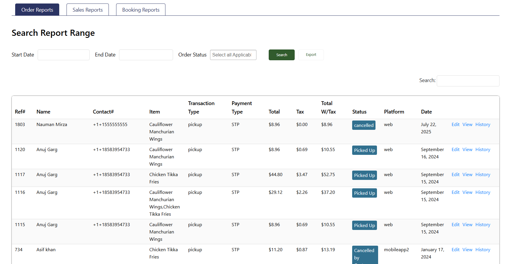 History Icon: This option displays the order's history.