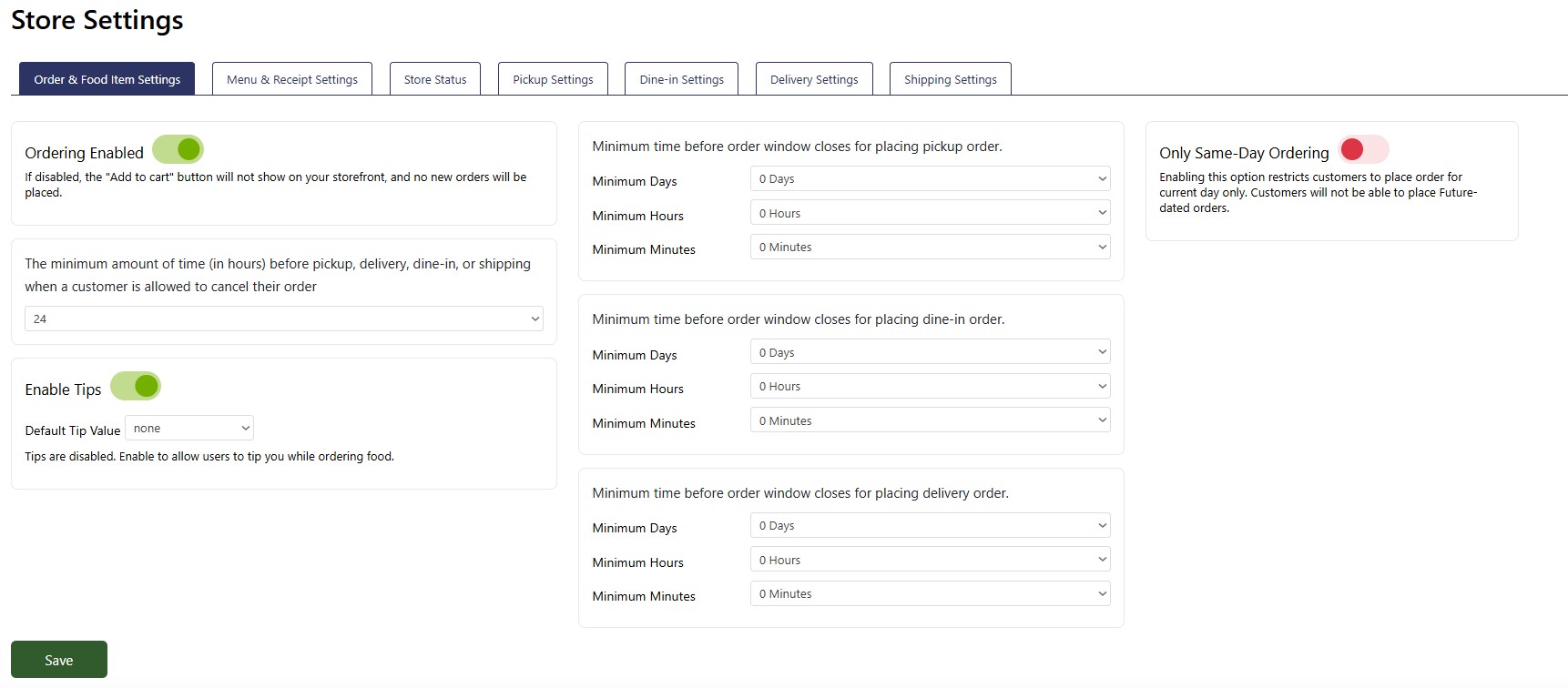 Enable Tips: This option allows customers to tip when placing orders. Disabling this option will turn off tips at checkout. If enabled, you can also set the default tip amount here.