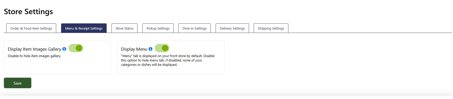 Display Menu: Toggle the button to turn the menu display on or off on the main page. Both these options should be enabled if you are actively taking orders for your store.