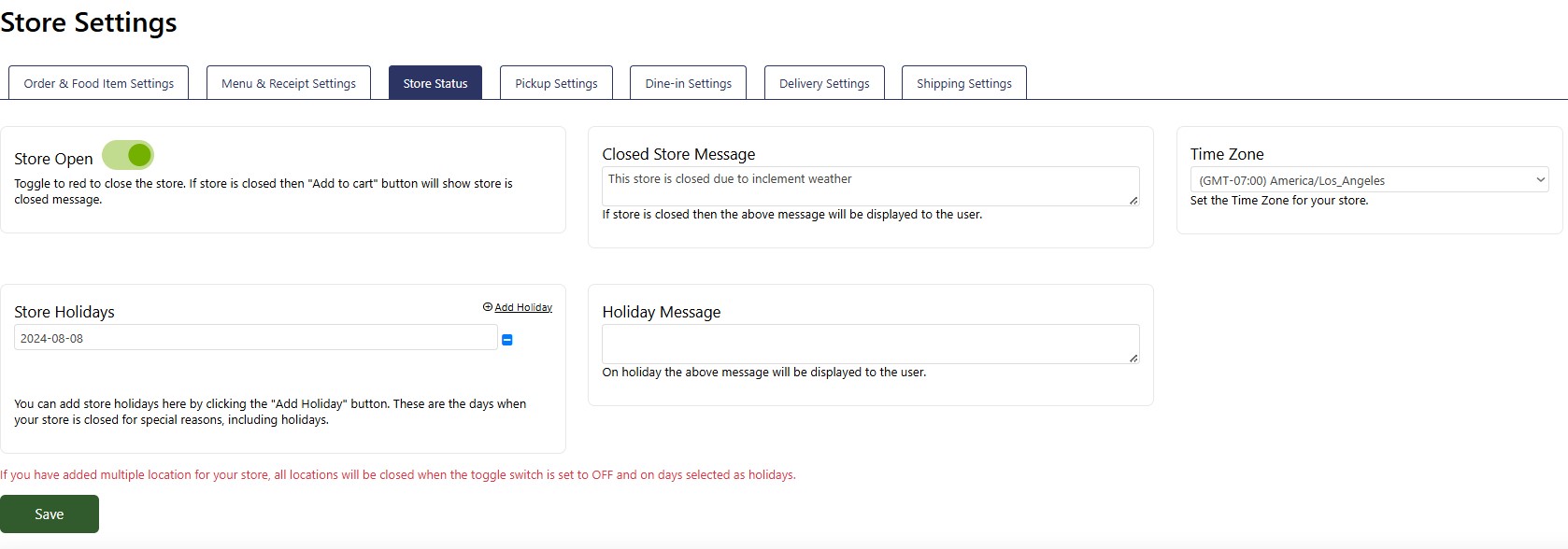 Store Holidays: Click the "Add Holiday" button to add holidays. You can set these days in advance when your store will be closed. The customers will not be able to order food for these days.