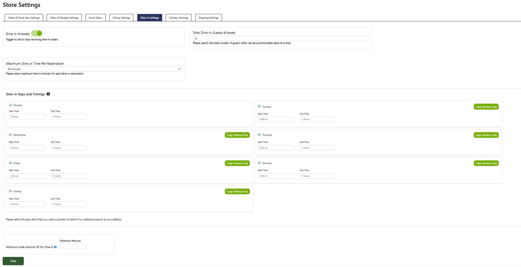 Dine-in Days and Timings: Set the specific days and start/end times for dine-in reservations by selecting each day and entering the appropriate hours. This feature allows you to customize your store's weekly dine-in schedule fully, ensuring customers are aware of when dine-in is available.