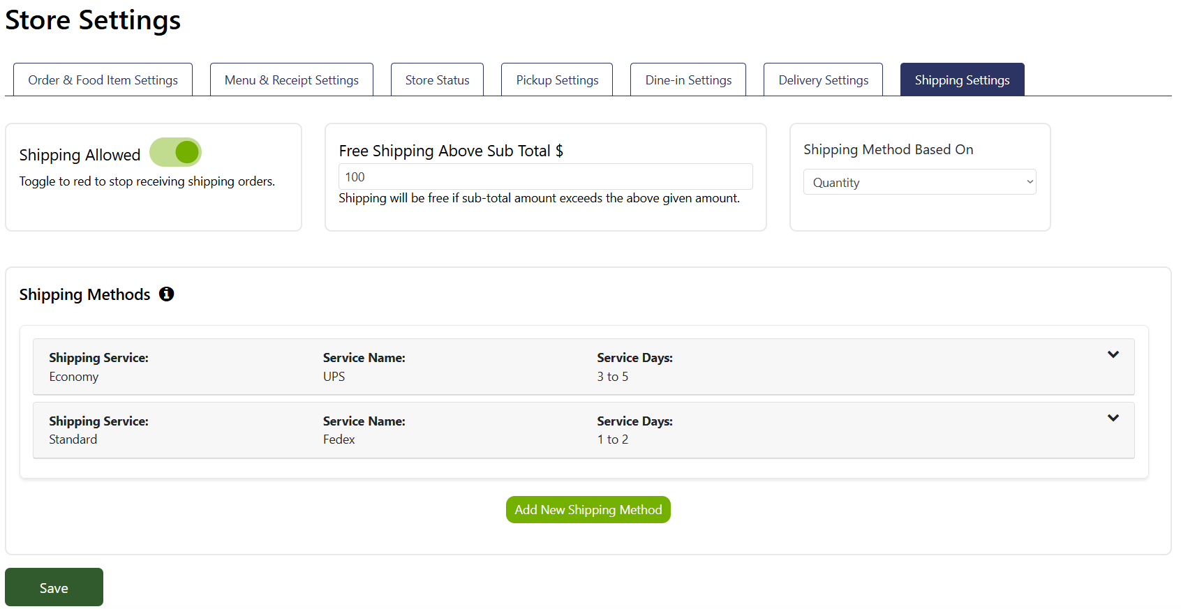 Shipping method based on: This selection only has one option “Quantity” at the moment, this means that shipping fees will be calculated based on quantity of dish items.