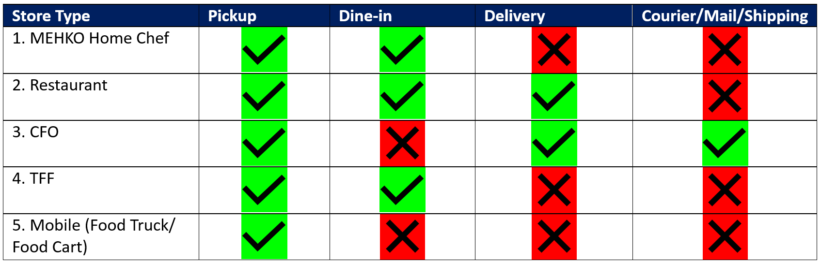 Depending on your store's license type, you can offer pickup, dine-in, delivery or shipping services. Following table shows the ability to offer services based on your license type.